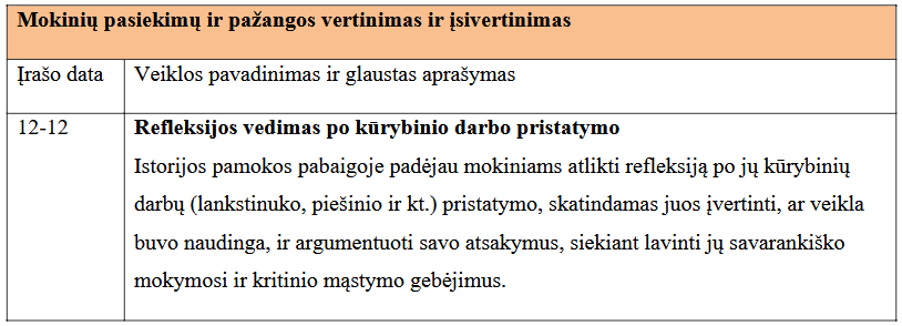 Asistuojant mokytojui geografijos ir istorijos pamokose, geriausiai sekėsi padėti mokiniams atlikti refleksijas apie jų kūrybinius darbus ir analizuoti jų mokymosi pažangą.