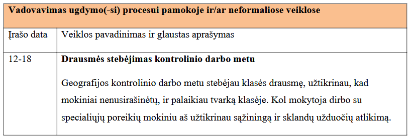 Taip pat sugebėjau užtikrinti klasės drausmę kontrolinio darbo metu ir padėti mokytojui stebėti mokinių elgesį pamokoje. Didžiausias iššūkis buvo parengti pamokos stebėjimo protokolus, nes tai reikalavo daug kruopštumo ir laiko.